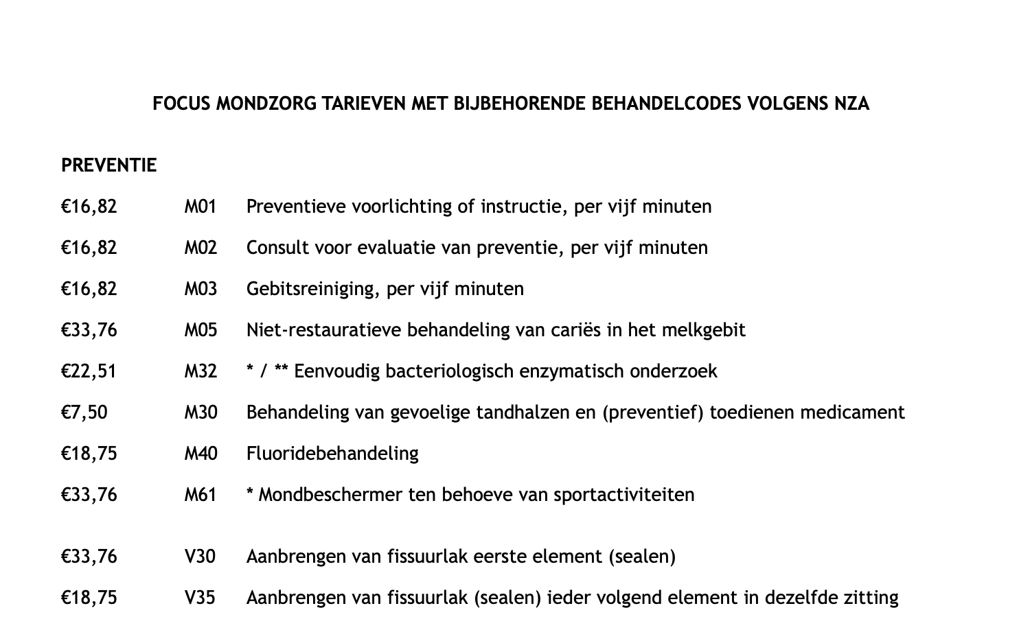 Hieronder zijn de tarieven (01-01-2026 t/m 31-12-2026) te vinden welke binnen Focus Mondzorg in rekening gebracht kunnen worden, afhankelijk van de individuele situatie: